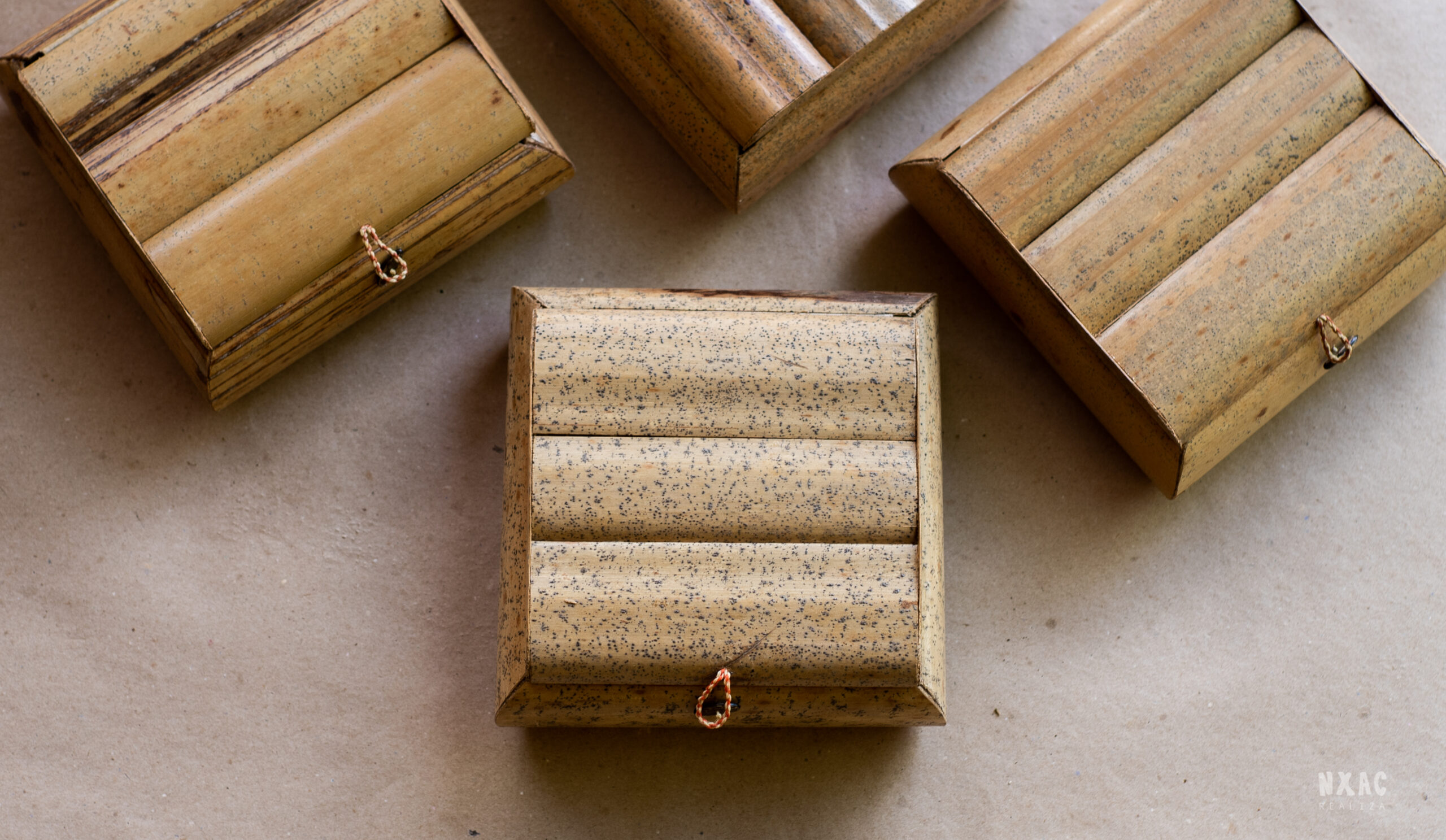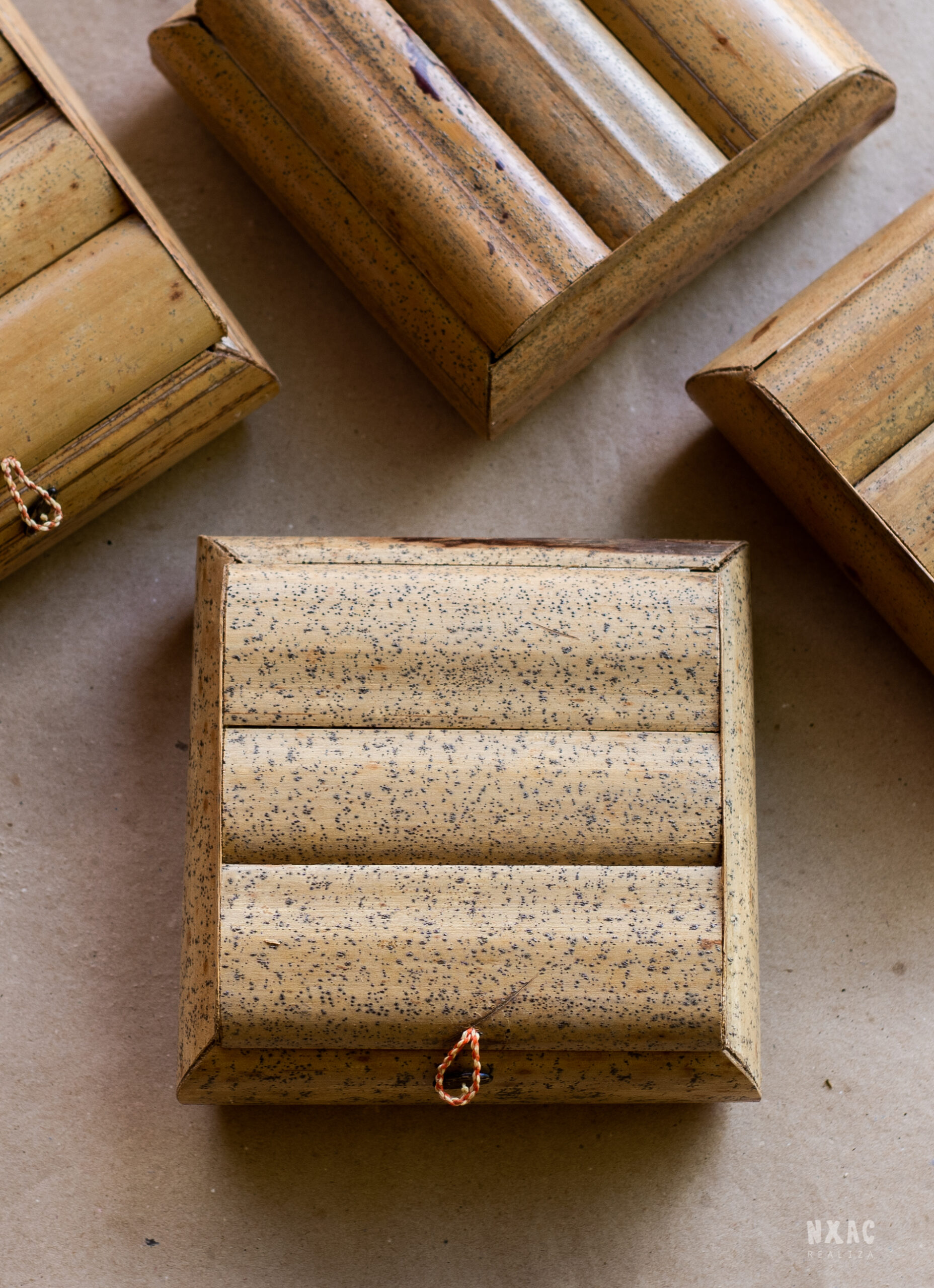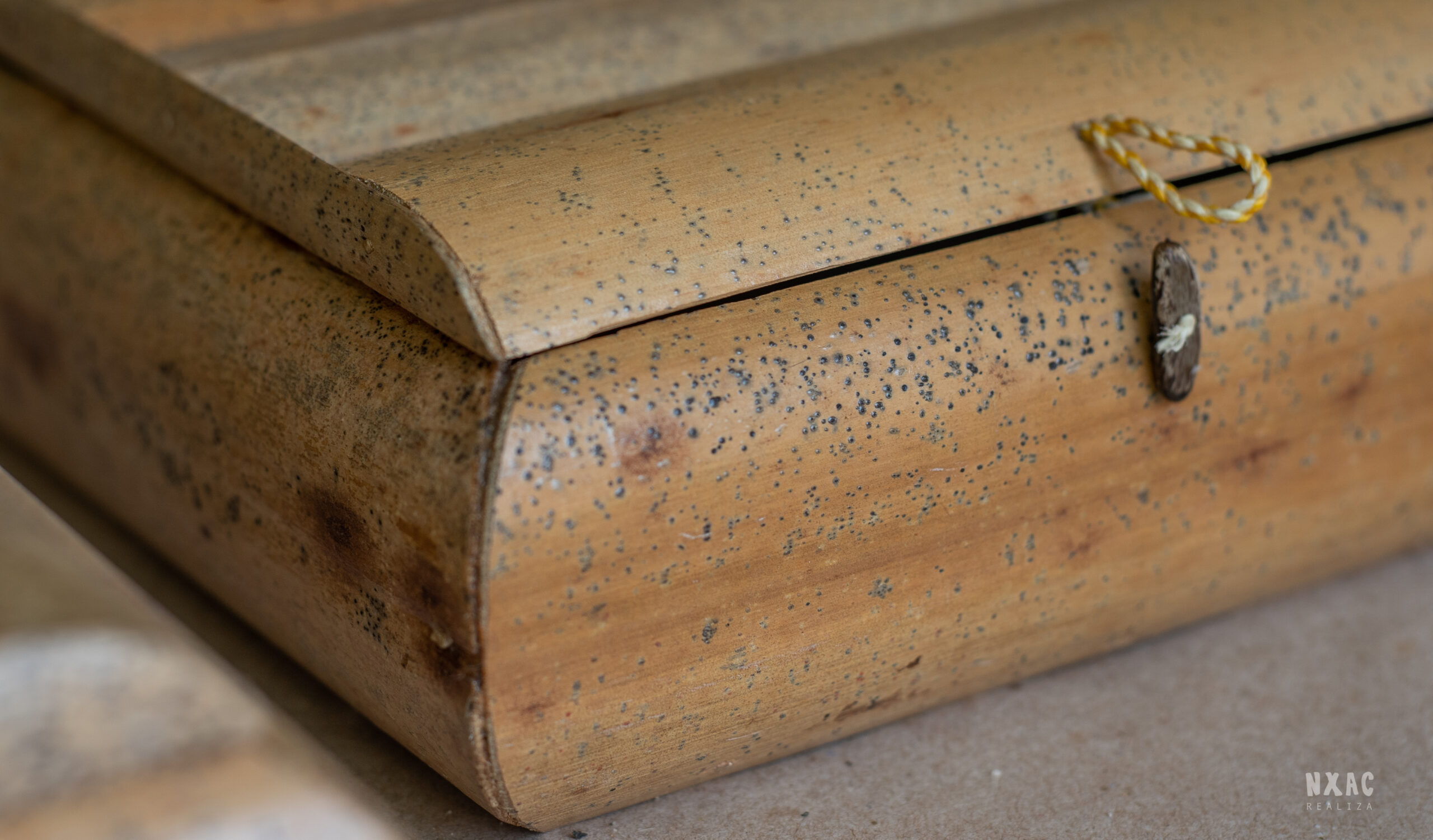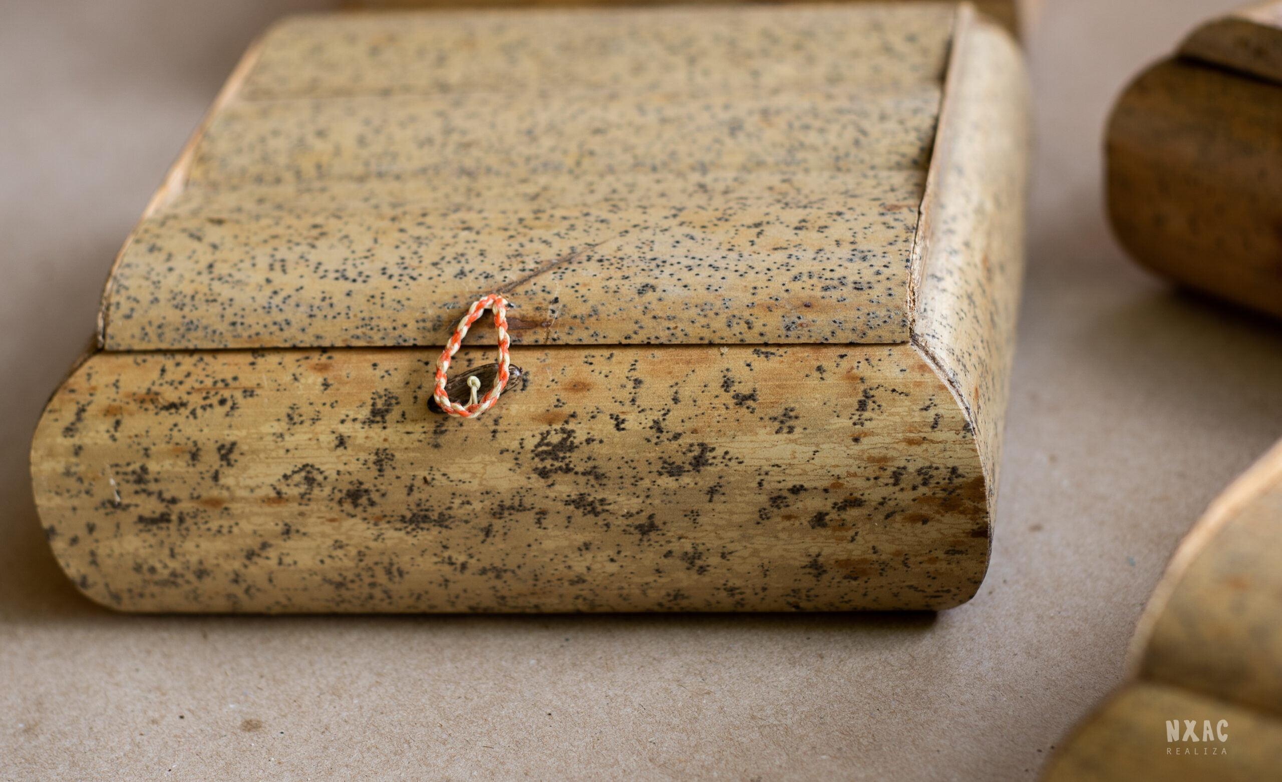 Caixa em Buriti, dobradiça em tecido, fecho em linha encerada e semente de Flamboyant.